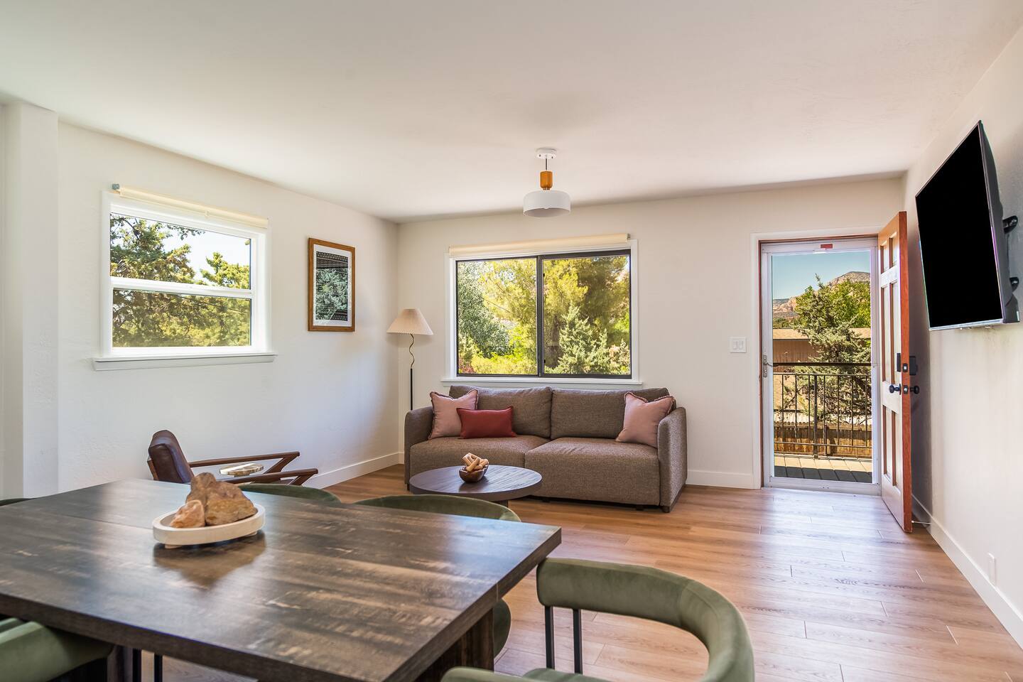 We’re delighted to share our newly renovated West Sedona home with you! Enjoy breathtaking views of the iconic West Sedona skyline whether you're in the open concept living room & kitchen, either of the two bedrooms, or on our expansive private deck. Inside, you’ll find a bright and airy space with stylish modern decor. We can’t wait for you to experience the beauty and comfort of our home!