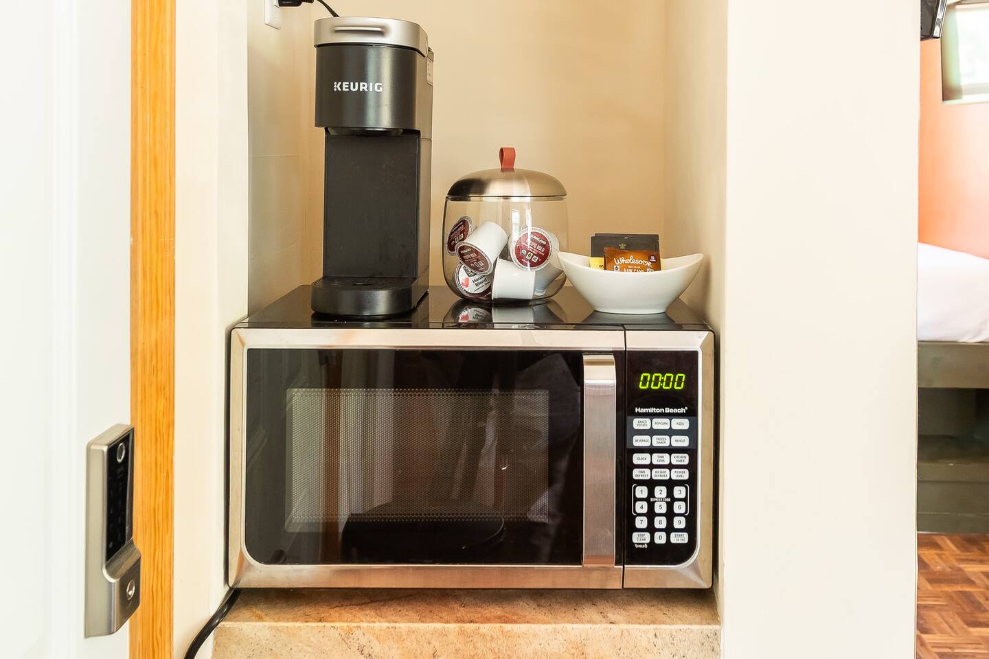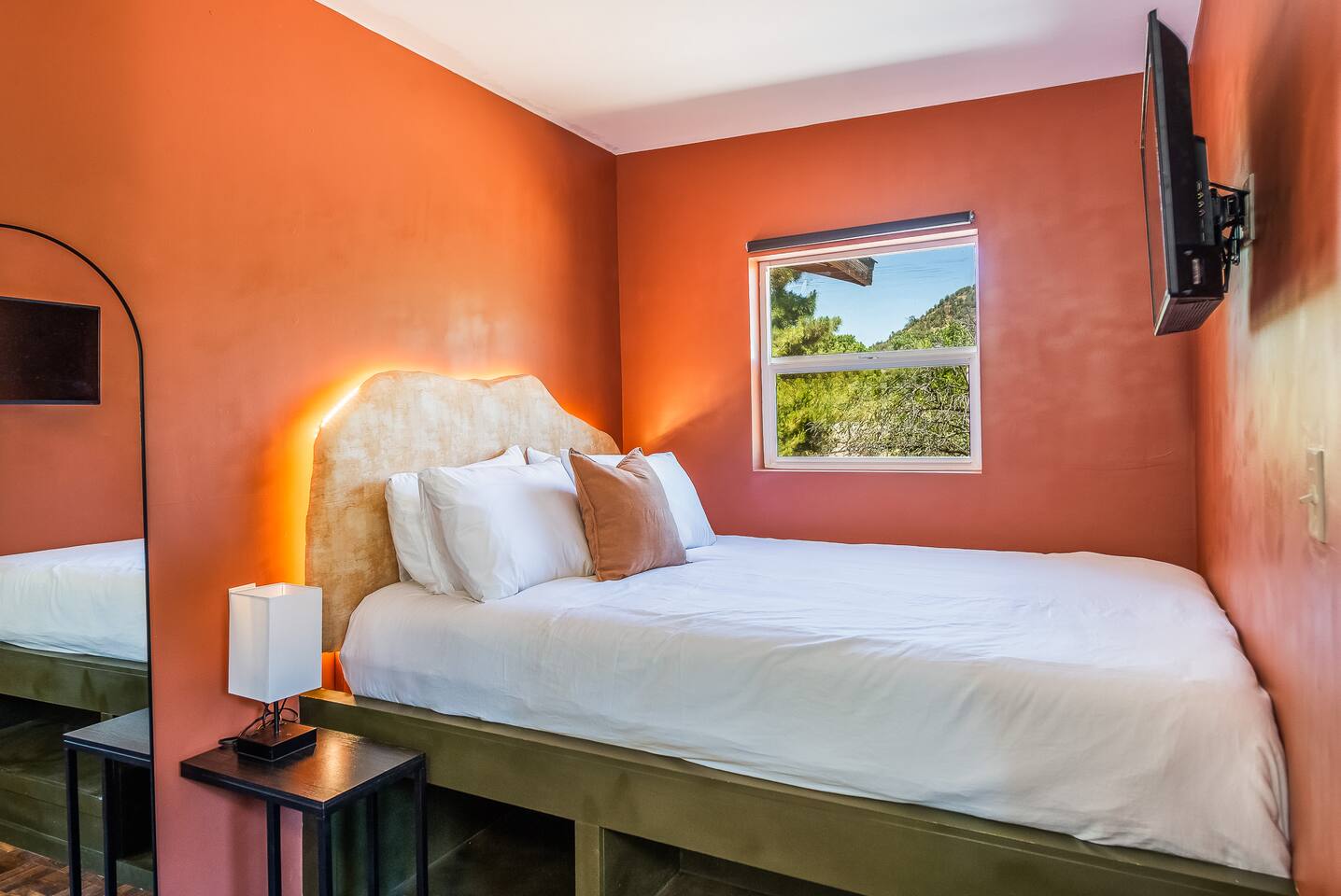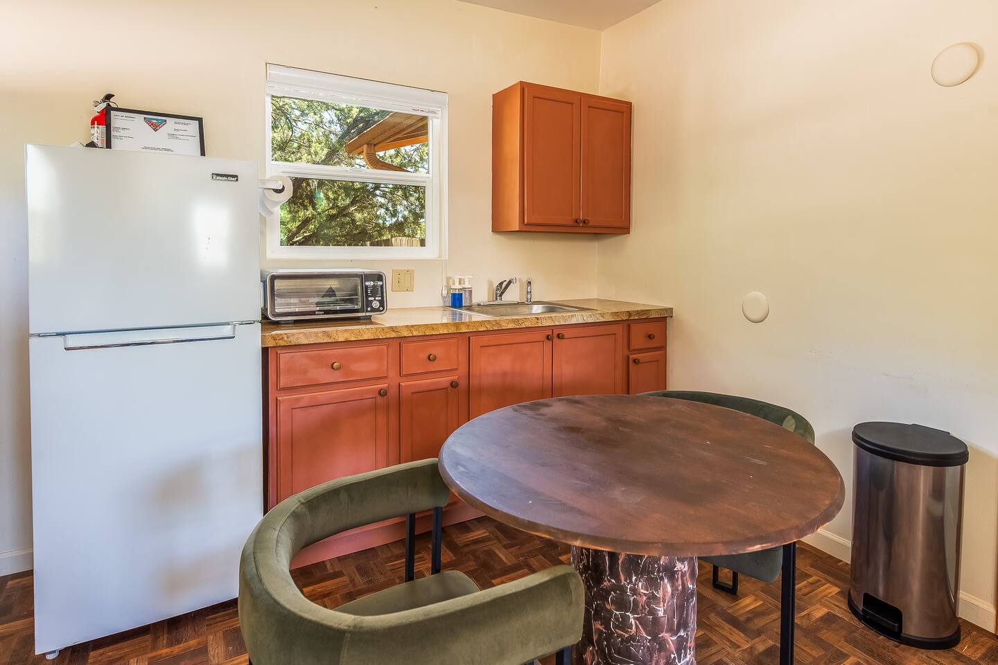 This cozy 310 sqft studio is small, but mighty—thoughtfully designed to maximize the use of space. Queen Bed • Custom built-in sleeping nook with ample storage space underneath • Hotel-quality cotton linens provided— no stuffy polyester sheets here! Sleeper Sofa • Folds out into a Twin-size bed. Kitchenette • Includes a sink, hot plate, pots, pans, toaster oven air fryer, and microwave— please note there is *no* stove • Keurig coffee maker with complimentary coffee pods, sugar, and creamer provided Bathroom • Standing shower • Toiletries provided: towels, body soap, shampoo, conditioner, and hair dryer Exterior • Private deck with red rock views